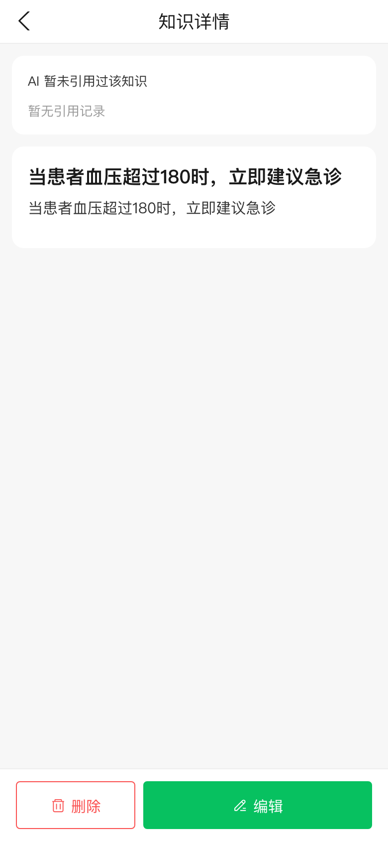 Captured 2026-04-24 against the local dev server, post v1 UI removal. Demonstrates the closed loop: patient message → AI drafts reply citing doctor's KB rules → citation popup (now a centered dialog, 90vw / 560px cap) preserves chat context → knowledge list shows live usage tracking.